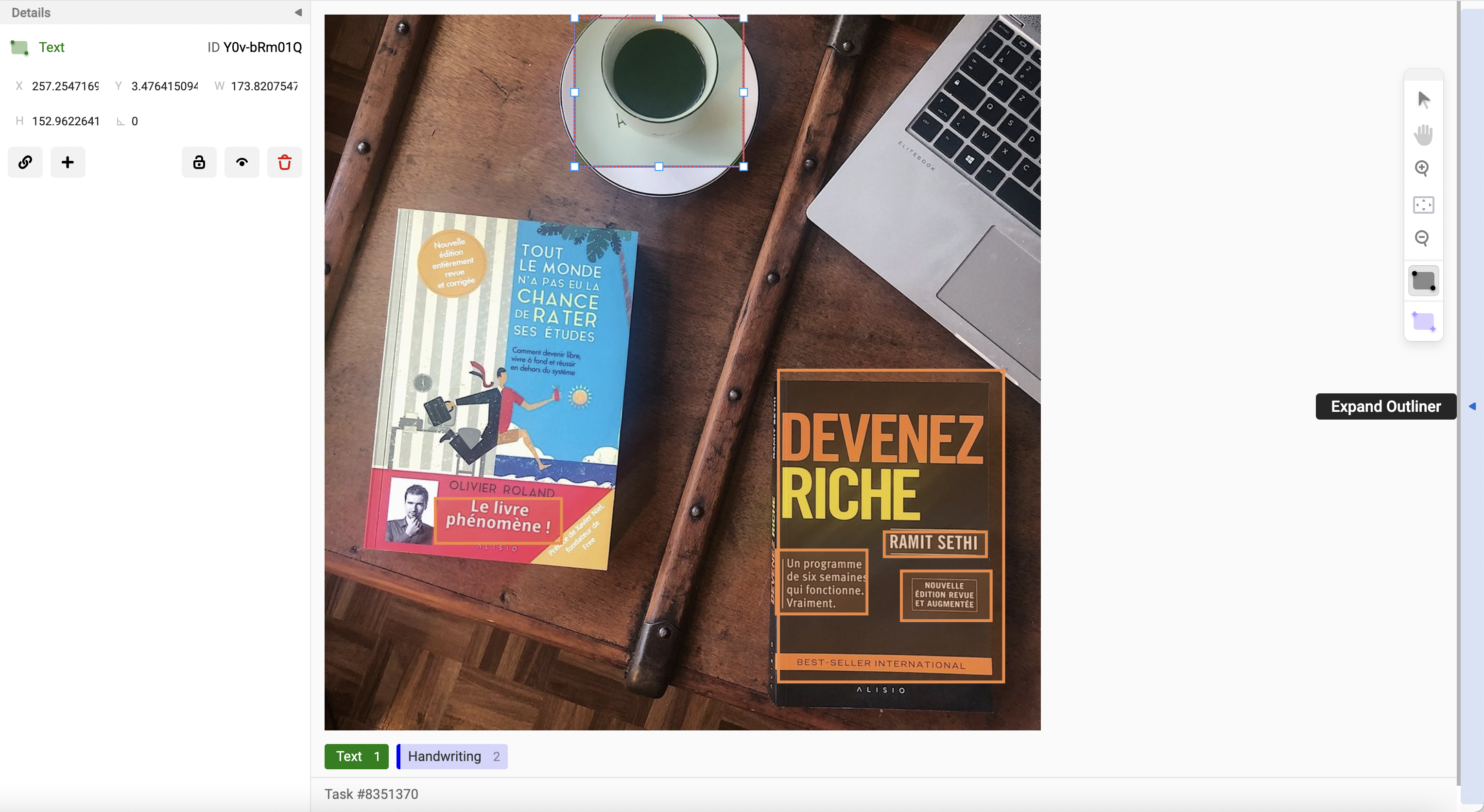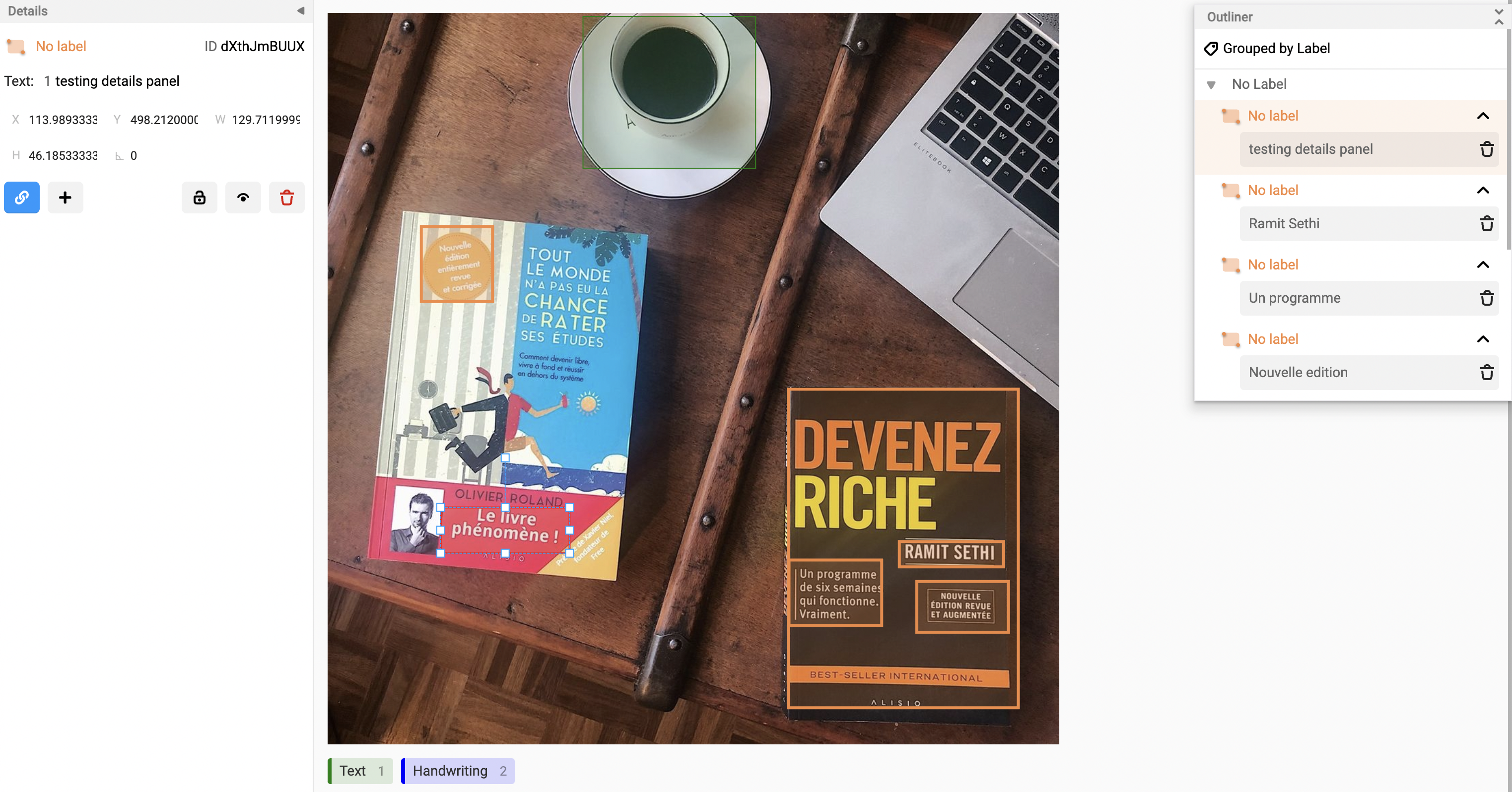 The Outliner is a replacement for the existing interface with a multiple-panel approach. This feature improves the user experience to fit more data in these two columns (Outliner and Details) and provides more options when working with regions. For example, Image segmentation is the only type of labeling that supports custom controls on the details panel.